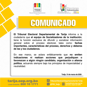 El Tribunal Electoral Departamental de Tarija recuerda que su equipo de socialización tiene una función estrictamente informativa.