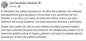 A través de una publicación difundida en sus redes sociales, el gobernador sostuvo que durante los “20 años del masismo” el Ministerio de Justicia se convirtió en un instrumento para perseguir, procesar y encarcelar a opositores políticos de Evo Morales y Luis Arce. Para Camacho, el cierre de la institución evidencia un intento concreto del actual Gobierno de distanciarse de estas prácticas.