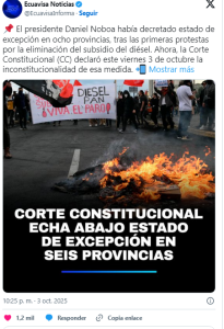 La Corte Constitucional de Ecuador anuló el estado de excepción en cinco de las siete provincias del país donde el presidente Daniel Noboa lo había decretado frente a las protestas indígenas contra la eliminación del subsidio al diésel, se informó el viernes (03.10.2025).