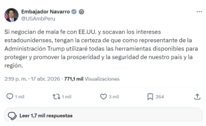 “Si negocian con mala fe con EEUU y socavan los intereses estadounidenses, tengan la certeza de que, como representante de la Administración (Donald) Trump, utilizaré todas las herramientas disponibles para proteger y promover la prosperidad y la seguridad de nuestro país y la región”, manifestó Navarro en un mensaje publicado en la red social X.