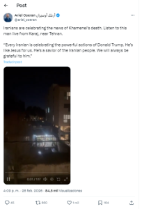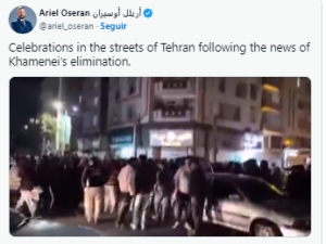 Pese al férreo control estatal y a la represión que históricamente ha caracterizado al régimen, circularon imágenes de ciudadanos que salieron a las calles en distintos puntos del país para celebrar la muerte del ayatolá. Videos difundidos por el periodista Ariel Oseran muestran a grupos de personas festejando en espacios públicos tras conocerse la noticia.
