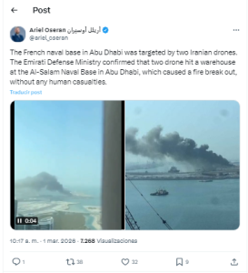 El régimen ha respondido mediante drones y misiles, como se observa en registros compartidos en redes sociales. El Ministerio de Defensa de los Emiratos Árabes Unidos confirmó que dos drones impactaron un almacén ubicado en la base naval de Al-Salam, en Abu Dabi. El ataque provocó un incendio, aunque no dejó víctimas humanas.