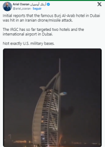 Asimismo, el hotel Burj Al-Arab, en Dubái, fue alcanzado por un ataque con drones o misiles iraníes. De acuerdo con la información disponible, hasta el momento han sido atacados dos hoteles y el aeropuerto internacional de Dubái en el marco de esta ofensiva.