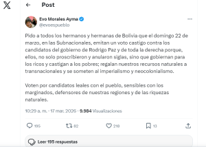 Por su parte, Evo Morales se pronunció mediante su cuenta en X, donde también convocó a la población a sancionar en las urnas a los candidatos vinculados a Paz y a sectores de oposición. “Pido a todos los hermanos y hermanas de Bolivia que el domingo 22 de marzo, en las Subnacionales, emitan un voto castigo contra los candidatos del gobierno de Rodrigo Paz y de toda la derecha”, escribió.