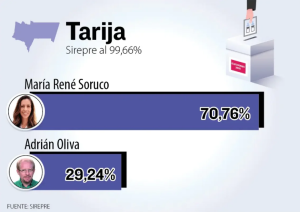 La candidata del partido Camino Democrático por el Cambio, María René Soruco, ganó el balotaje en Tarija, según el Sistema de Transmisión y Publicación de Resultados Electorales Preliminares (Sirepre) y anunció que de inmediato se pondrá manos a la obra para su gestión.