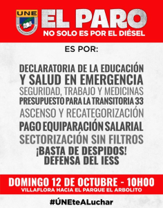 La UNE también exigirá la declaratoria de emergencia en el sistema educativo y sanitario, así como la defensa del Instituto Ecuatoriano de Seguridad Social (IESS) y la revisión de los despidos en el sector público, temas que consideran parte de una crisis estructural que afecta al país.