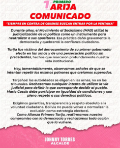 El alcalde de Tarija y candidato a la reelección por Primero Tarija señaló que «los estrados judiciales no pueden decidir lo que corresponde decidir al pueblo»
