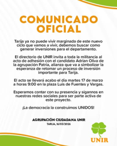 «El directorio de UNIR invita a toda la militancia al acto de adhesión con el candidato Adrián Oliva de la agrupación Patria, alianza que va a simbolizar la esperanza de retomar un proceso de inversión importante para Tarija», reza el comunicado difundido por la agrupación.