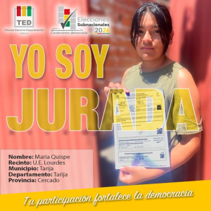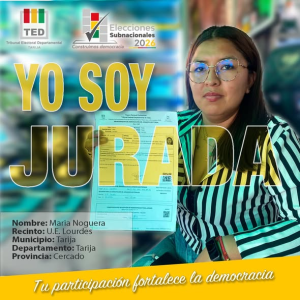 Tribunal Electoral Departamental de Tarija Reconoces el compromiso de las y los ciudadanos de todo el departamento que asumir谩n el rol de Jurados Electorales este 22 de marzo.