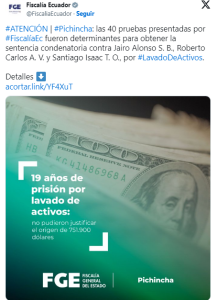 El Tribunal de Garantías Penales Especializado en Delitos de Corrupción y Crimen Organizado sentenció a Jairo Alonso S. B., Roberto Carlos A. V. y Santiago Isaac T. O. a diecinueve años de prisión como autores del delito de lavado de activos, tras el hallazgo de USD 751.900 en efectivo en su poder durante un control policial realizado en octubre de 2024.